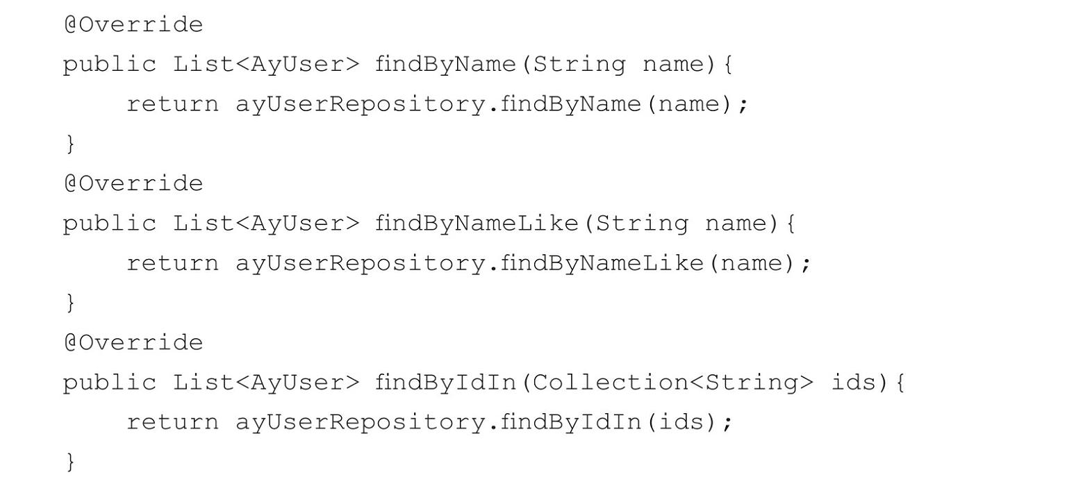 AyUserRepository类中的自定义查询方法开发完成之后,分别在类AyUserService和类AyUserServiceImpl中调用它们。