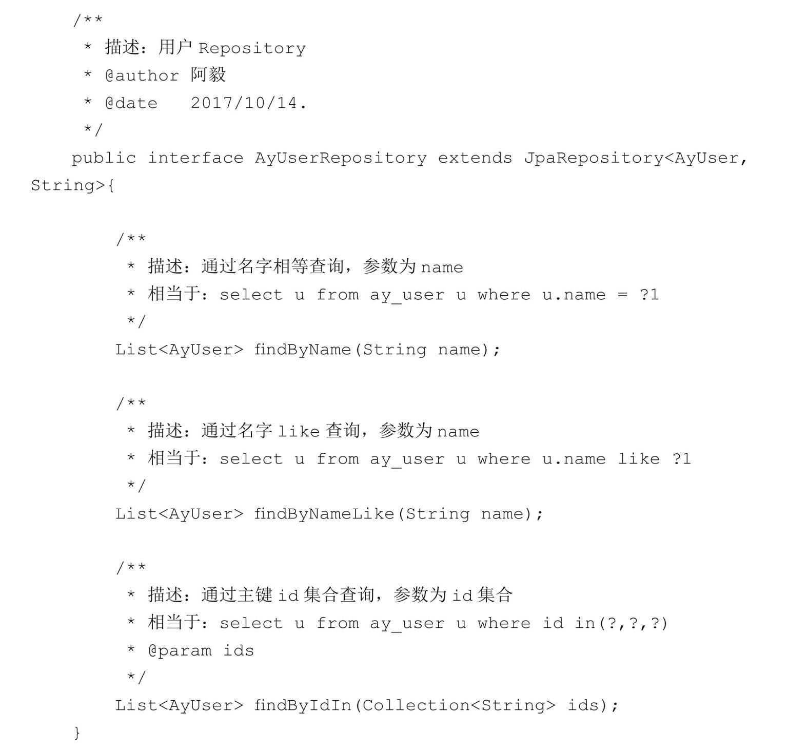 我们除了使用JpaRepository接口提供的增删改查分页等方法之外,还可以自定义查询方法。在AyUserRepository类中添加几个自定义查询方法,具体代码如下:
