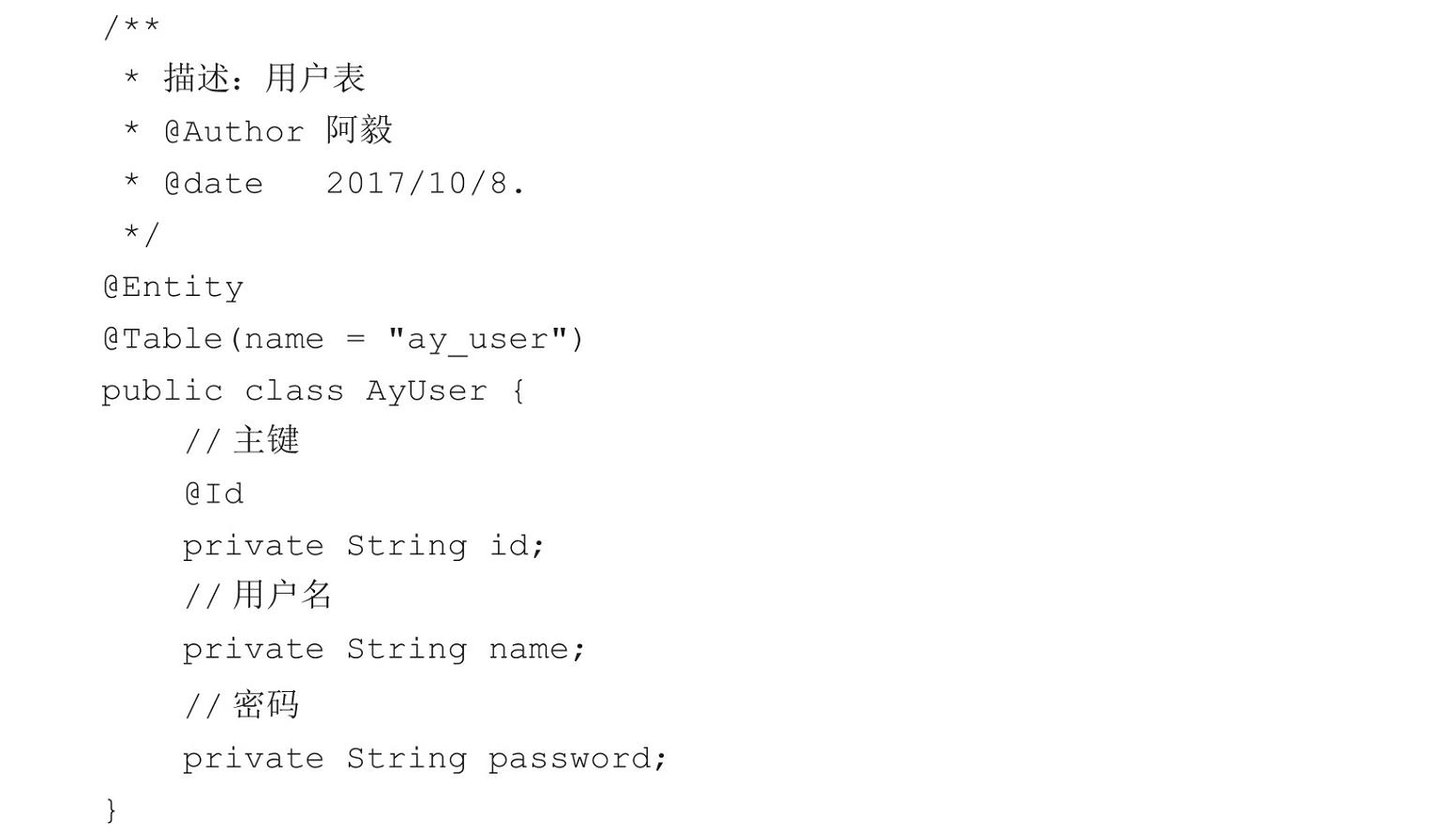 与此同时,我们需要在AyUser实体类下添加@Entity和@Id注解,具体代码如下: