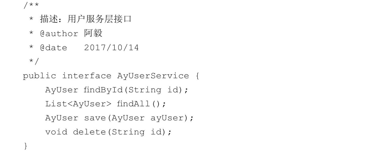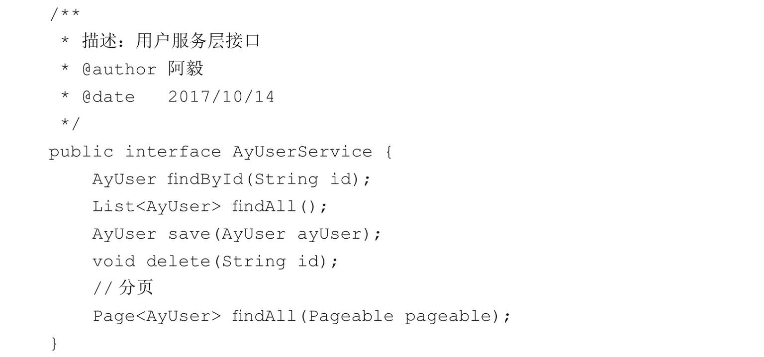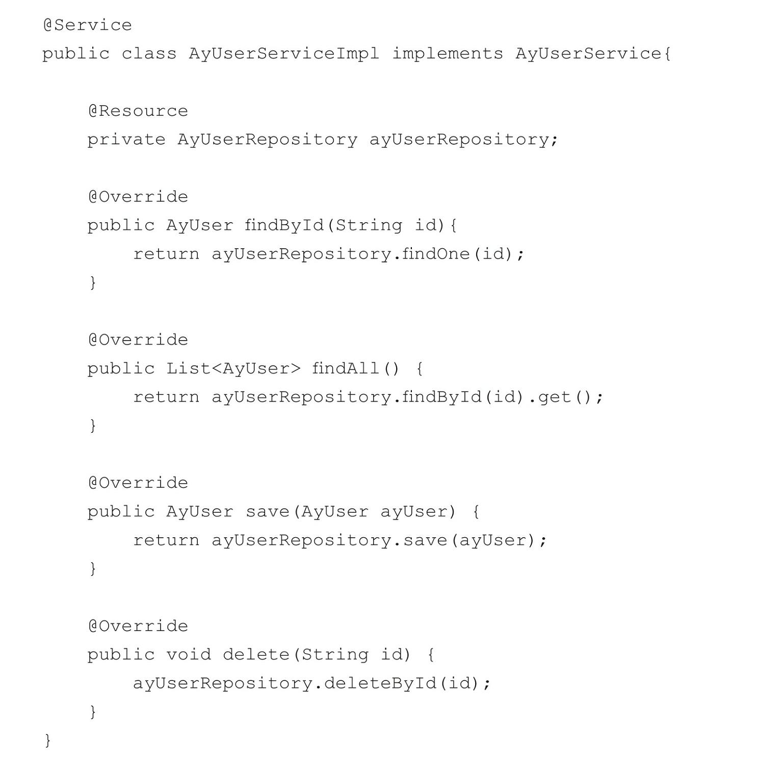 接口类AyUserService定义了4个接口,findById和findAll用来查询单个和所有数据,delete用来删除数据,save同时具备保存和更新数据的功能。接口实现类AyUserServiceImpl的代码如下: