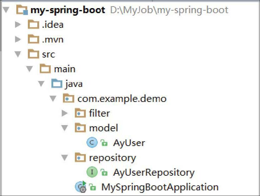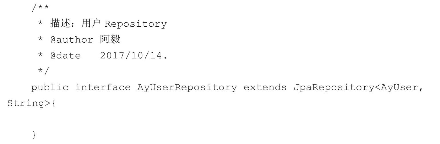 在pom.xml文件中引入依赖之后,我们在目录/src/main/java/com.example.demo. repository下开发一个AyUserRepository类,如图3-3所示,具体代码如下:
