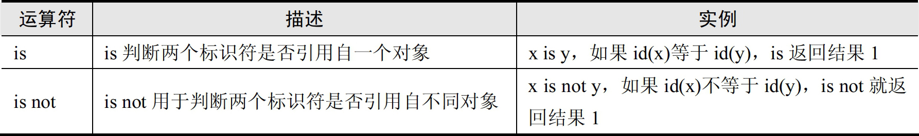 身份运算符用于比较两个对象的存储单元,表2-7为身份运算符的描述和实例。