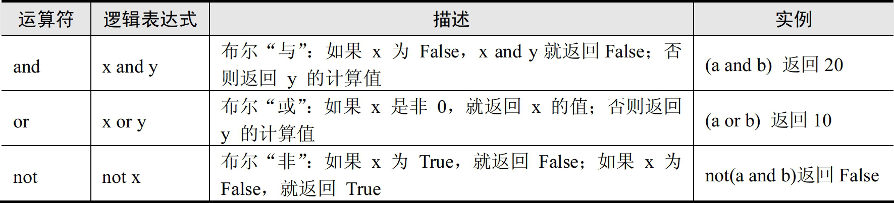 Python语言支持逻辑运算符。表2-5为逻辑运算符的描述和实例,假设变量a为10,变量b为20。