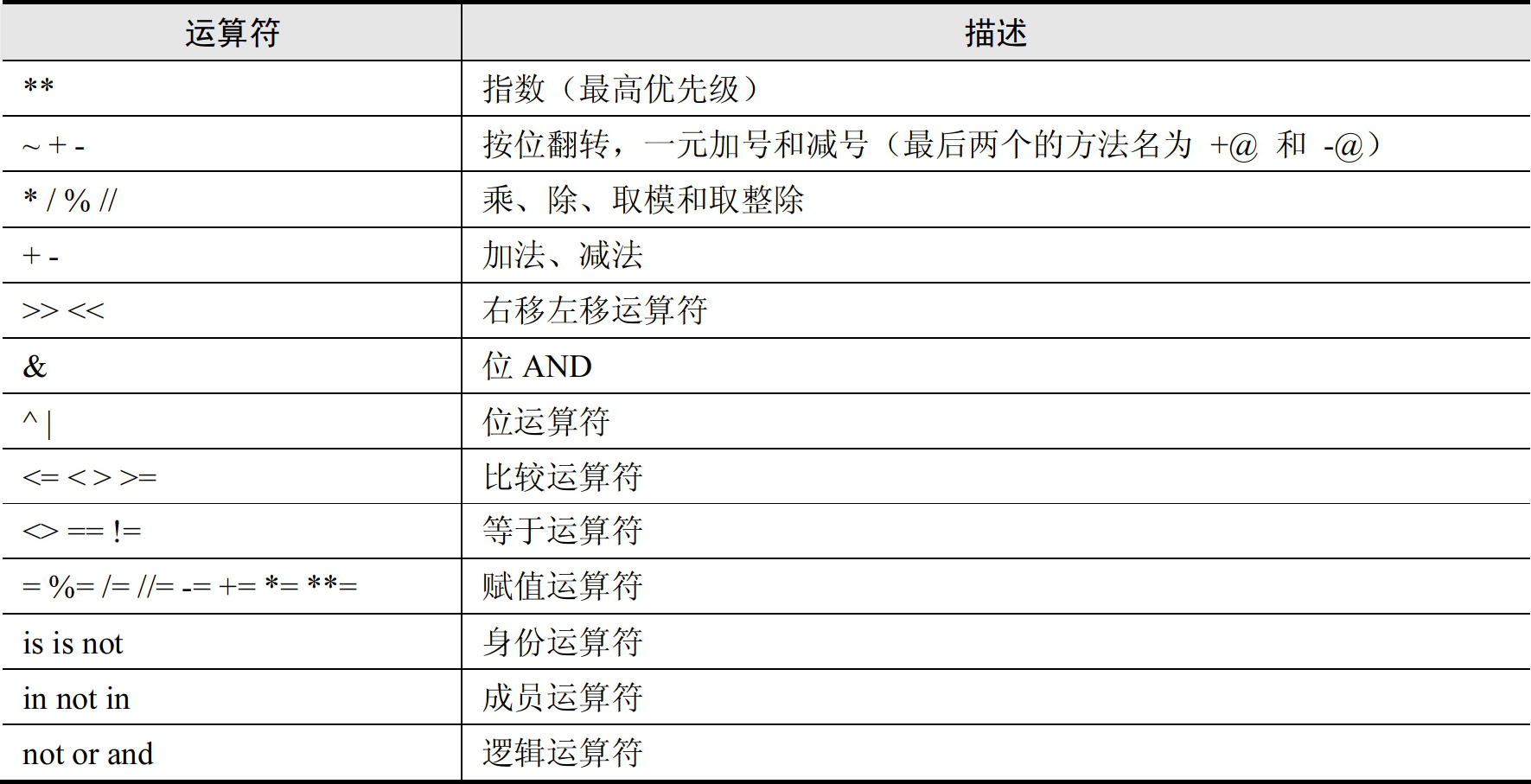 其他运算符的优先级在实际使用时可以自行尝试判断。若通过观察判断不了,则可以在交互模式下通过实验进行判断。