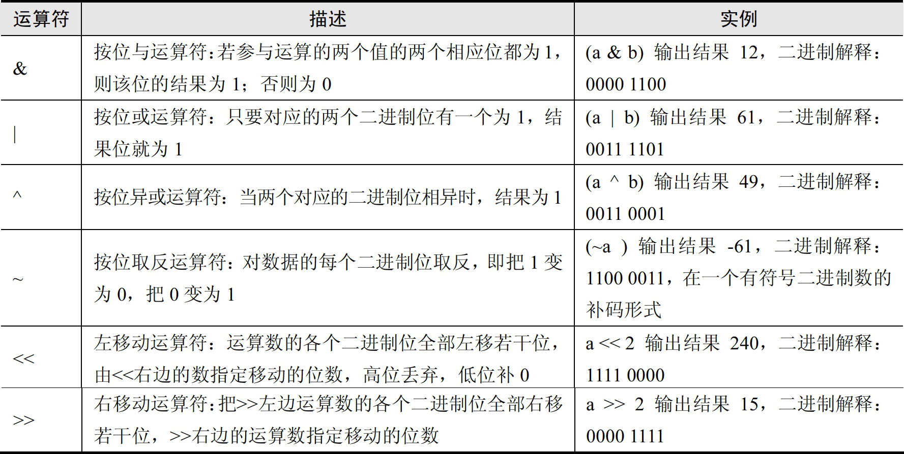 位运算符是把数字看作二进制进行计算的。表2-4为Python中位运算的描述和实例。假设变量a为60,变量b为13。