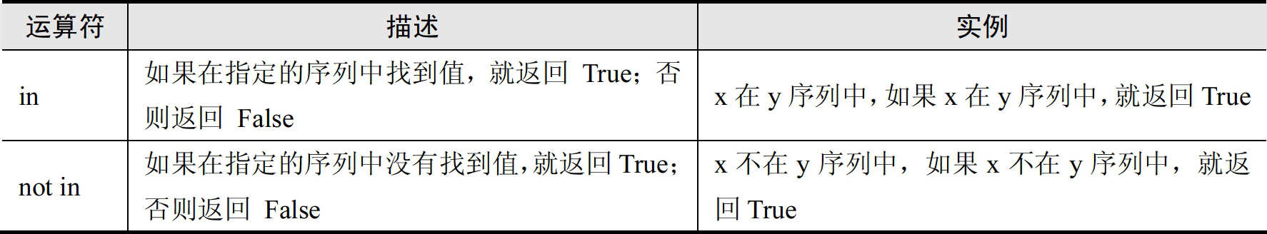 除了之前介绍的运算符外,Python还支持成员运算符,表2-6为成员运算符的描述和实例。