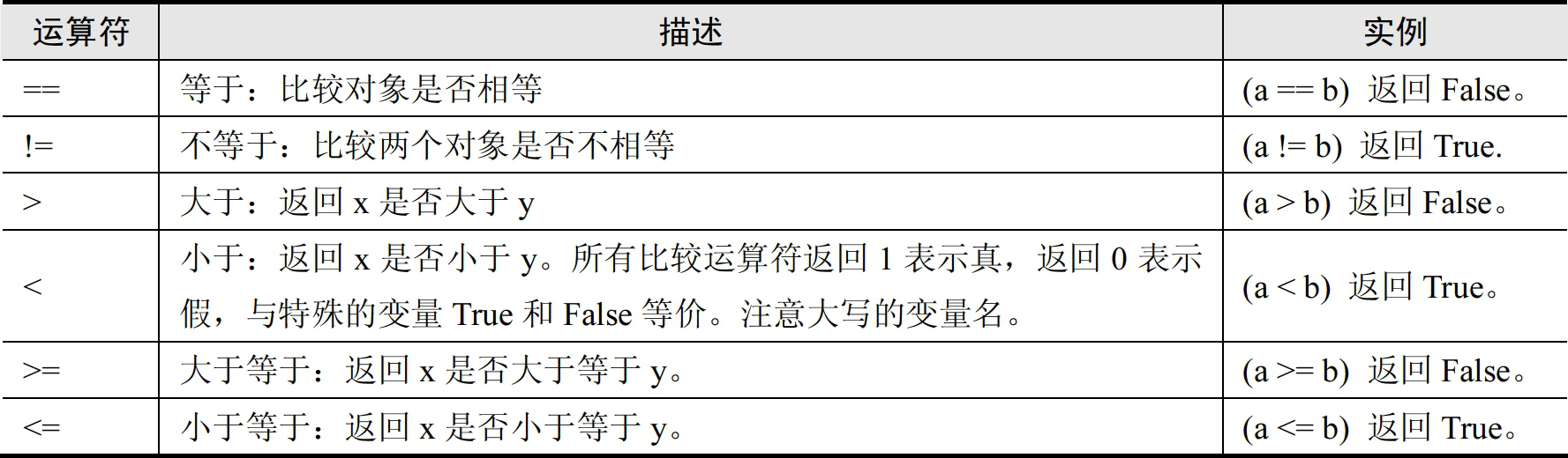 表2-2为比较运算符的描述和实例。以下假设变量a为10、变量b为20。
