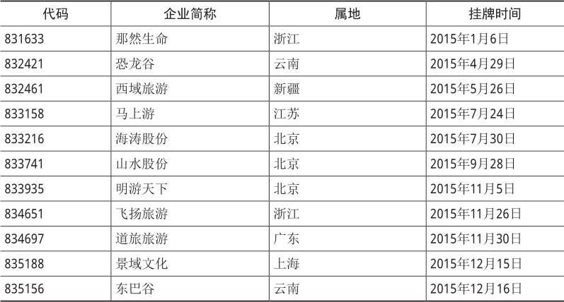 同时可以看到,新三板由于门槛较低,逐渐受到旅游企业追捧,仅在2015年,就有10多家旅游综合企业挂牌新三板,且多数处于赢利状态,如表2-1所示。