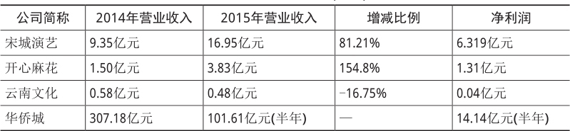 在本年度,大中型演艺企业有两大特点:一是国有文艺院团在资源、技术、资金、政策等优势下,不断提高演艺企业的市场化程度和竞争程度,总体依旧引领国内演艺市场的发展,在保证平稳发展的基础上加强了对原创作品的重视,尤其是以国家大剧院、北京人艺、中国儿童艺术剧院等发展不错的企业为代表,出现演出市场转型、演出营销更加多元、演出市场种类多元、市场化运作更明显等现象;二是民营演艺企业表现抢眼,日渐赢得资本市场青睐。如2015年,宋城演艺营业收入高达16.95亿元,同比增长81.21%,线上线下演艺齐发力;开心麻花营业收入达3.83亿元,同比增长154.8%;云南文化营业收入达0.48亿元,虽然增幅下降,但仍斩获0.04亿元的净利润。总体来看,不论是国有文艺院团,还是民营演艺企业,二者在资本市场中的竞争均在不断加剧,如表3-2所示。