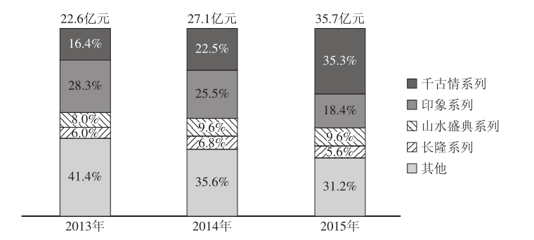 据道略演艺数据显示,2015年全国旅游演出票房收入35.7亿元,增长比例达31.7%;观众4713万人次,同比增长31.2%。其中,实景和主题公园旅游演出发展较好,以38.6%的场次贡献了76.3%的票房,尤其是主题公园类旅游演出平均票房达1.2亿元;另外值得一提的是千古情、印象、山水系列依然是市场主导,其中千古情、印象(又见)、山水系列以及长隆系列旅游演出剧目实收票房总额达24.6亿元,占年度旅游演出总票房收入的68.8%,尤其是千古情系列占据市场1/3票房,如图3-3所示。