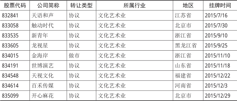 表3-5 2015年演艺企业(部分)新三板挂牌一览