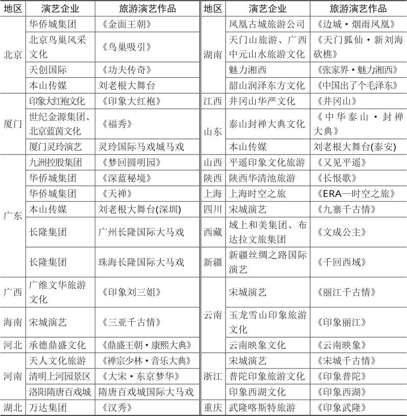 2015年,为进一步促进旅游与演艺的融合,各地区纷纷依托当地的自然资源、文化资源,积极探索“旅游+演艺”的新形式,为旅游市场带来新的经济增长点。据道略演艺数据,2015年全国旅游演出在演剧目195台,新增18台。3月,武汉市打造长江实景演艺秀;4月,福建武夷山推出瀑布山水实景秀;5月,宋城演艺在福州打造“海上丝绸”主题演艺;10月,敦煌推出《敦煌盛典》,利用高科技打造实景舞台。部分地方旅游演艺作品,如表3-4所示。这些代表性旅游演艺创新项目,不仅激发了当地的旅游经济,促进了文化传播,也为演出产业创新积累的经验。