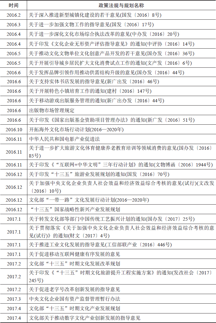 表2-1 2016年以来国家发布的文化产业政策法规及规划目录