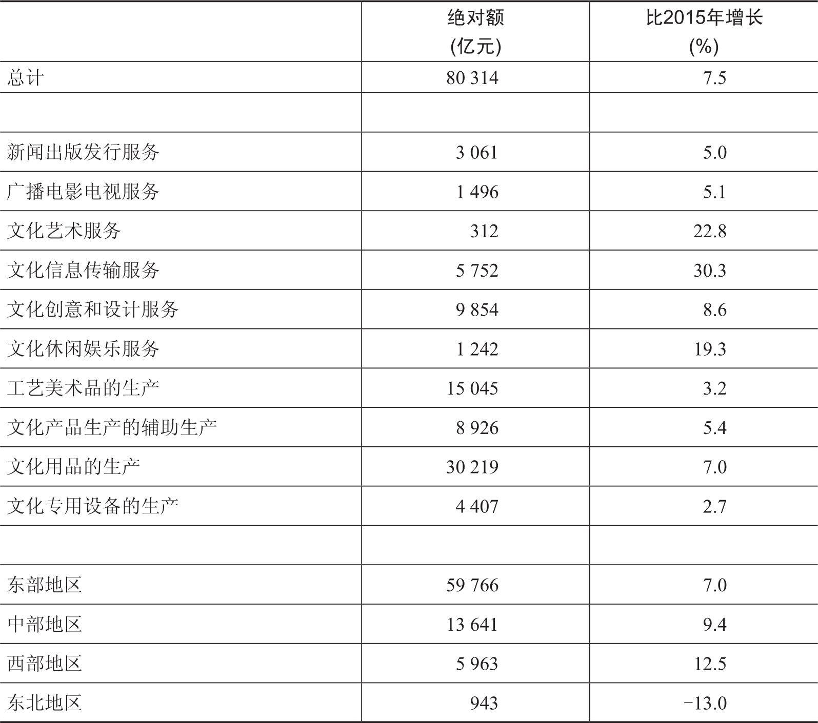 各传统文化行业总体发展不平衡,文化艺术服务企业与文化休闲娱乐服务企业增长较快。据国家统计局对全国规模以上文化及相关产业5万家企业调查,2016年,上述企业实现营业收入80 314亿元,比2015年增长7.5%(名义增长未扣除价格因素),增速比2015年加快0.6个百分点,增速整体高于全年GDP6.7%的增长速度。其中,实现两位数以上增长的传统文化行业分别是:文化艺术服务业312亿元、增长22.8%,文化休闲娱乐服务业1 242亿元、增长19.3%,但均低于以“互联网+”为主要形式的文化信息传输服务业营业收入5 752亿元、30.3%的增长。增速低于平均水平的是新闻出版发行服务5.0%、广播电影电视服务5.1%、工艺美术品的生产3.2%、文化产品生产的辅助生产5.4%、文化用品的生产7.0%、文化专用设备的生产2.7%,如表4-1所示。