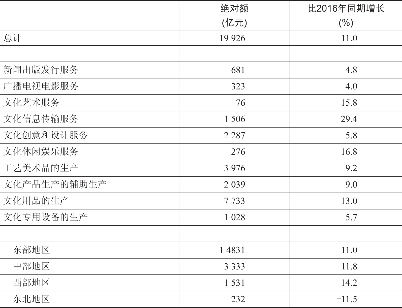 据对全国规模以上文化及相关产业5.2万家企业调查,2017年1季度,上述企业实现营业收入19 926亿元,比2016年同期增长11.0%(名义增长未扣除价格因素),增速提高2.4个百分点,实现较快增长。在传统文化产业中,除广播电视电影服务业外,8个行业的营业收入均保持增长。其中,实现两位数以上增长的3个行业分别是:文化休闲娱乐服务业276亿元、增长16.8%,文化艺术服务业76亿元、增长15.8%,文化用品的生产7 733亿元、增长13.0%,但仍低于以“互联网+”为主要形式的文化信息传输服务业营业收入1 506亿元、29.4%的增长,如表4-2所示。