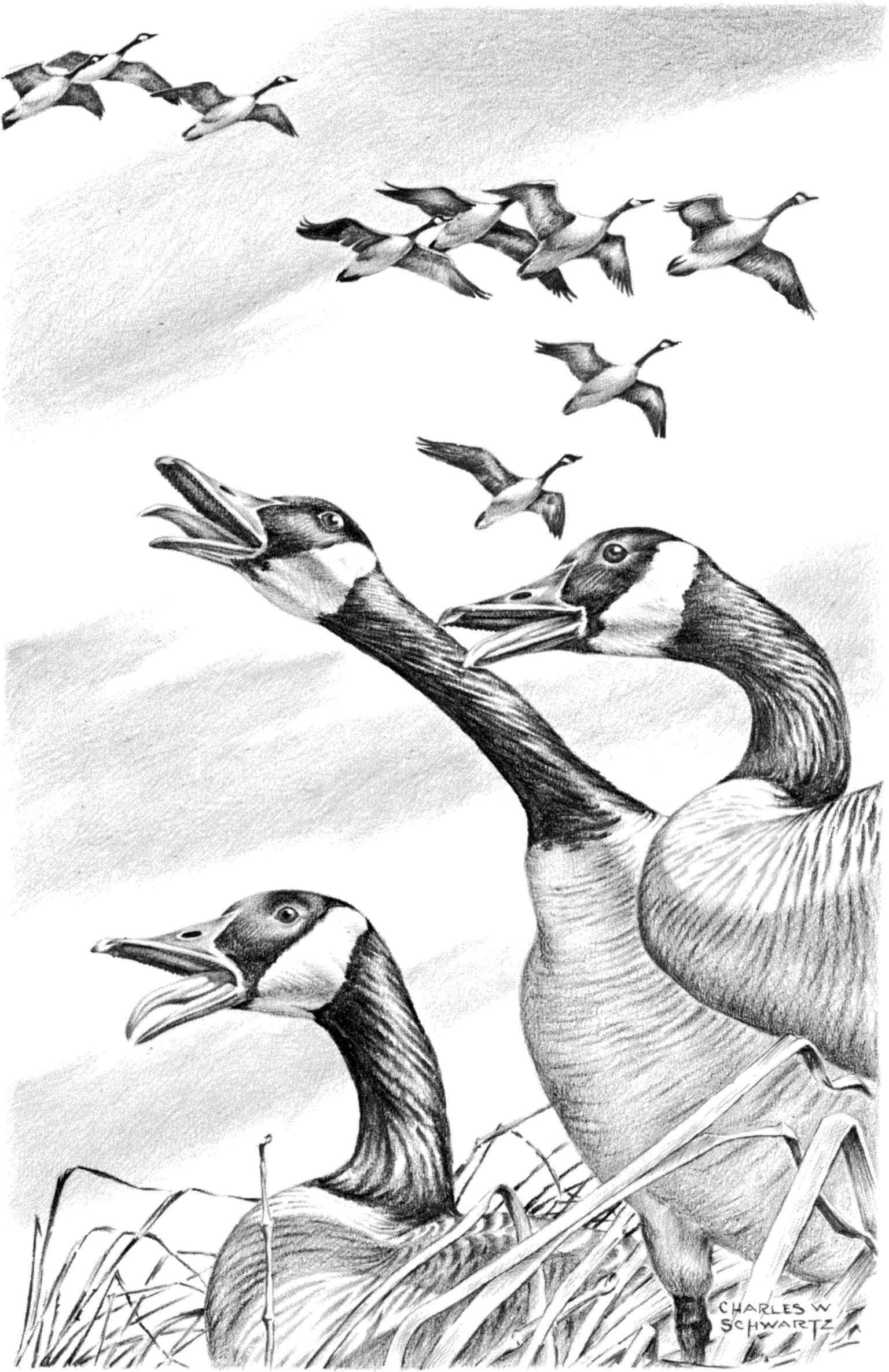 一旦第一群大雁来到这里,它们便向每一组迁徙的雁群高声地喧嚷着发出邀请,因此,不消几天,在沼泽里到处都可以看到它们。在我们的农场,我们根据两个标准来衡量我们春天的富足:所种的松树和停留的大雁的数目。一九四六年四月十一日,我们记录下来的大雁数目是六百四十二只。