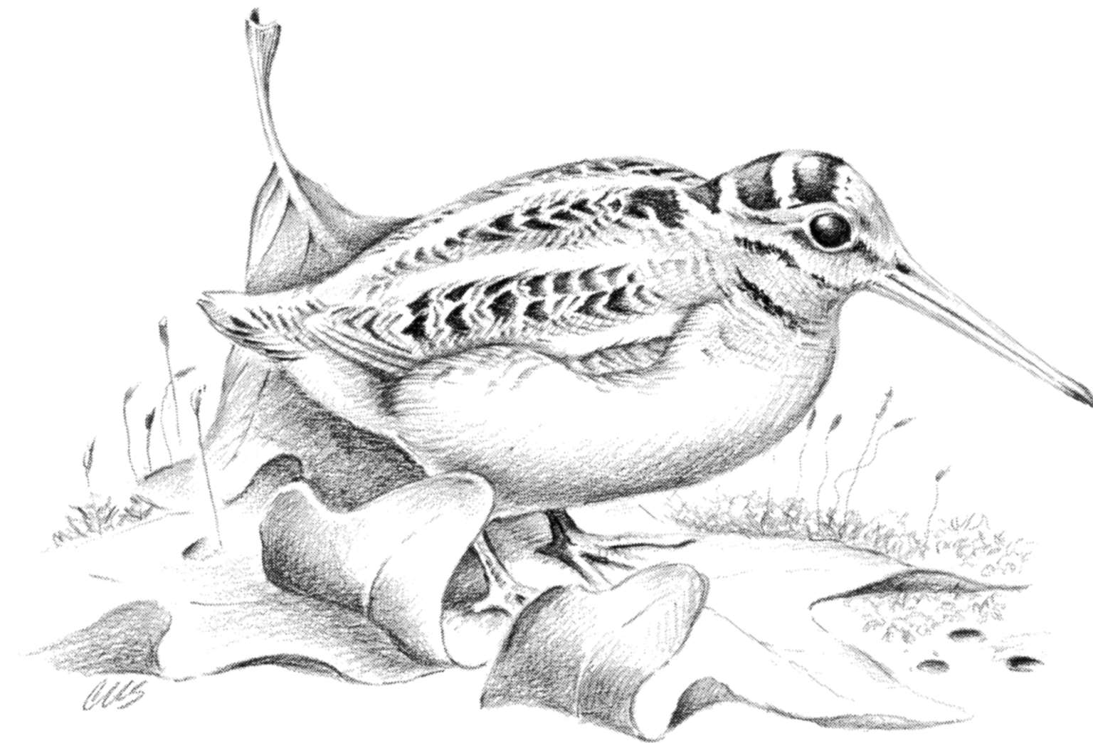 知道了地点和时间,你就让自己坐在舞场东面的一丛灌木下面,等待着,在夕阳的映照下望着小丘鹬的到来。它从某个邻近的树丛中低低地飞来,落在光秃秃的苔藓上,并立即拉开了序幕:一连串古怪沙哑的“噼咿”声,其间有两秒钟的间歇,听起来特别像夏天里夜鹰的叫声。