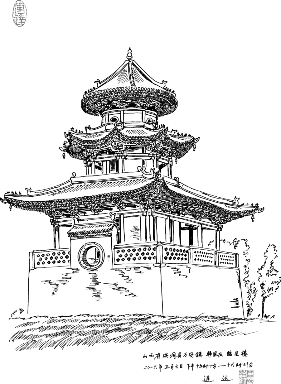 在韩家庄东南方的农田里还有一座造型奇特的魁星楼,我寻古多年以来,这样的建筑还是头一次见到,虽然说不上有多么惊世骇俗,但至少在北方民间的古建筑中是很罕见的。