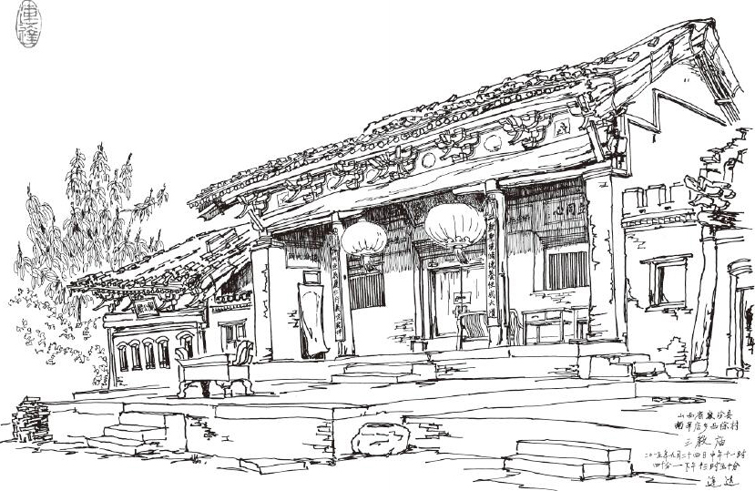当我走进这空空荡荡的院中,并不见一个人影,只有清风徐徐,树影摇曳,我坐在东墙根下,举伞遮挡着刺眼的烈日完成了三教庙的写生。