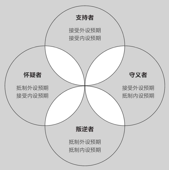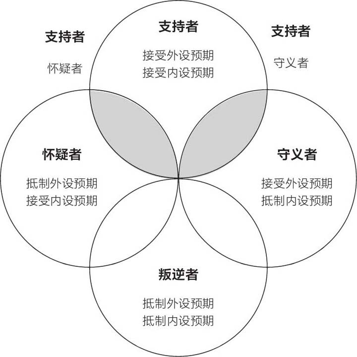 相反,支持者兼守义者则更加倾向完成外设预期。对于支持者兼守义者来说,外设预期的负担感觉上要更重一些,如果两者起冲突,外设预期也许更容易胜过内设预期。这样的支持者兼守义者也许会苦于设定限制,在最极端的情况下,他们甚至会演绎出支持者兼守义者式的反叛。在大多数情况下,他们很容易达成内设预期和外设预期,但偶尔也会“掉链子”——不能给他们自己必要的中途休整(这一点大多数支持者都能做到),于是便爆发性地拒绝达成某个预期。
