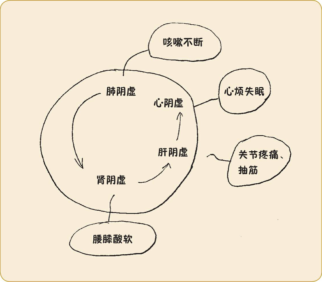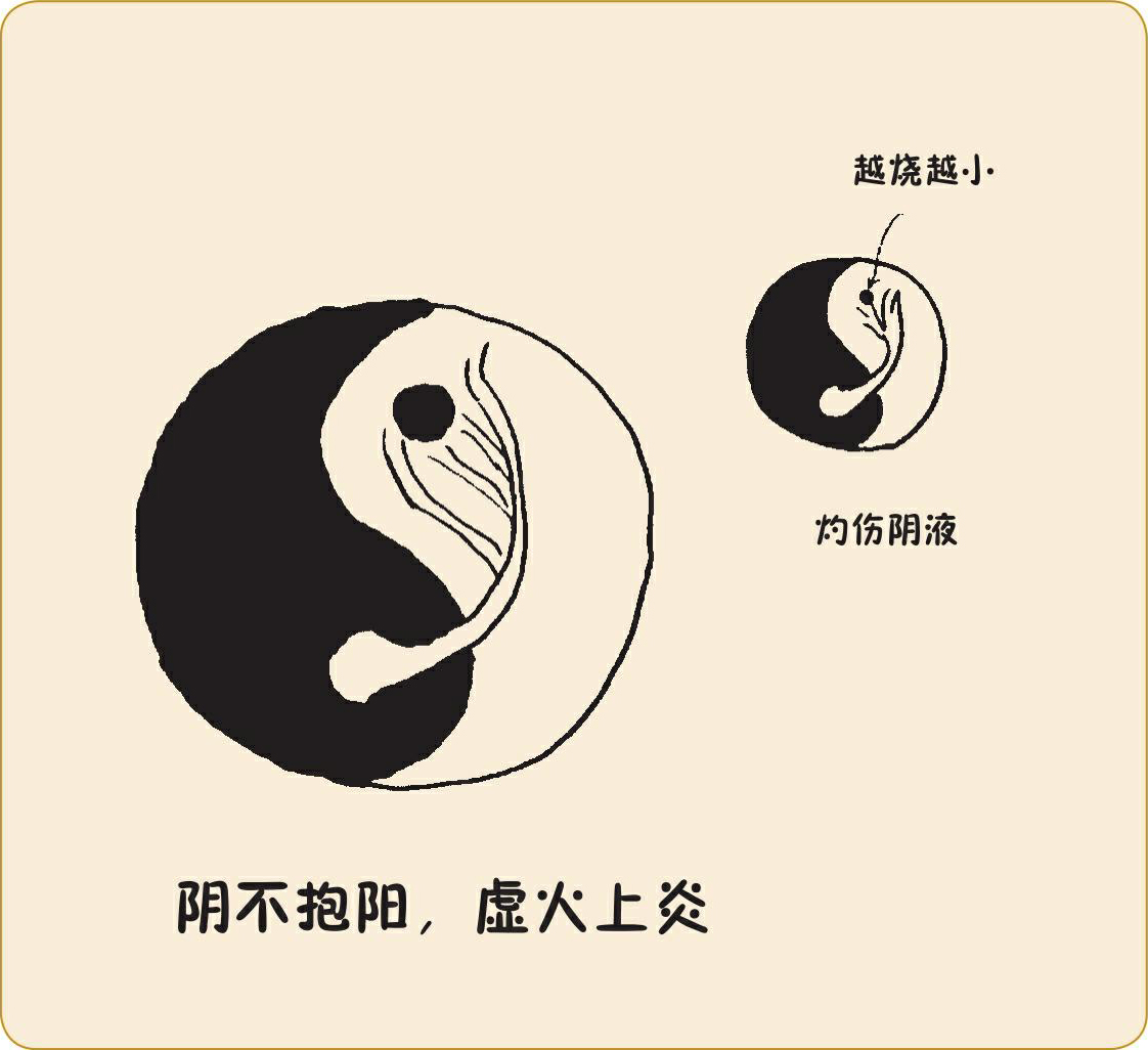 再重新复习一下这张阴虚的图:阴虚后,阴不抱阳,阳就会飞升到上面灼烧心阴和肺阴。
