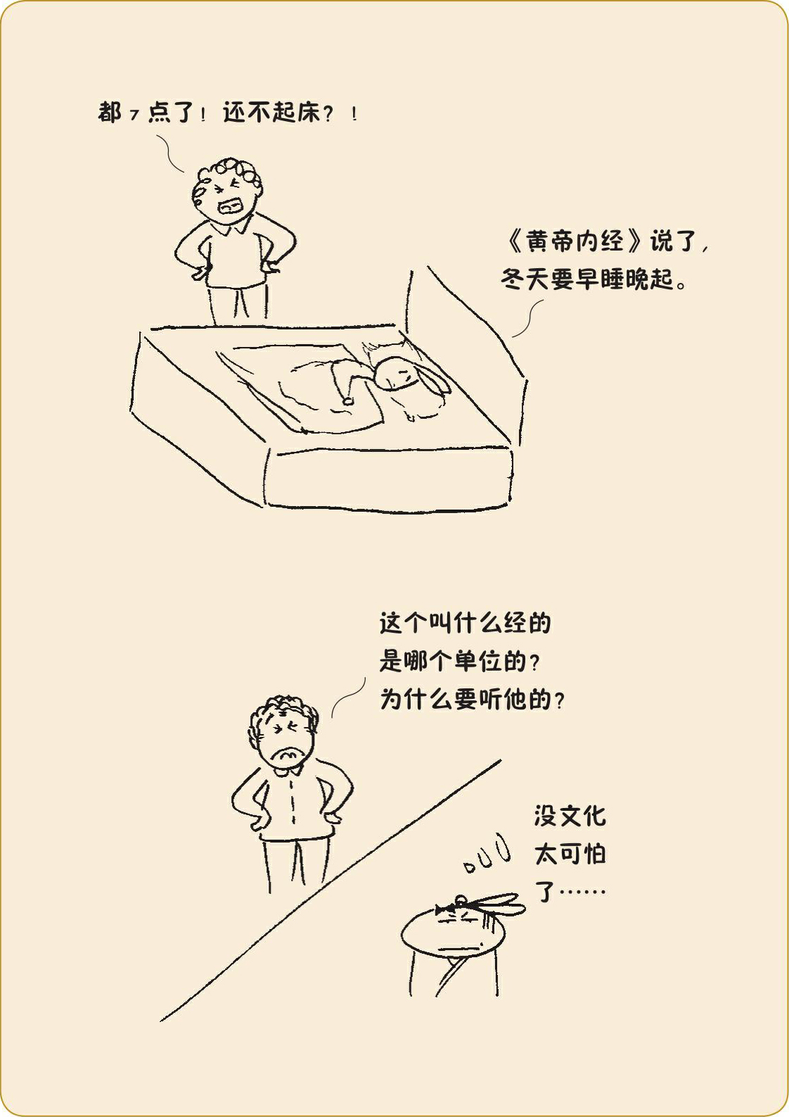 所以《黄帝内经》主张冬天的时候要“早卧晚起,必待日光”,意思就是冬天的那三个月,应该早睡,等太阳出来了再起来,这样才能很好地收藏阳气,等到来年开春,再将阳气生发。