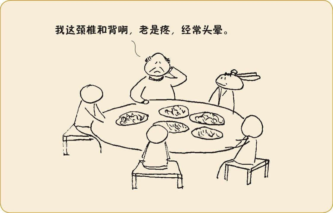 这位大叔的身体怎么了呢?通过摸……来摸去,我发现他的后背和颈部僵硬极了,按不动,特别硬。这是非常不好的事情,这代表他的气血不通,有明显的瘀血,所以他才会后背强直和颈椎难受。瘀血导致经络不通,无法将气血输送给大脑,造成了眩晕。