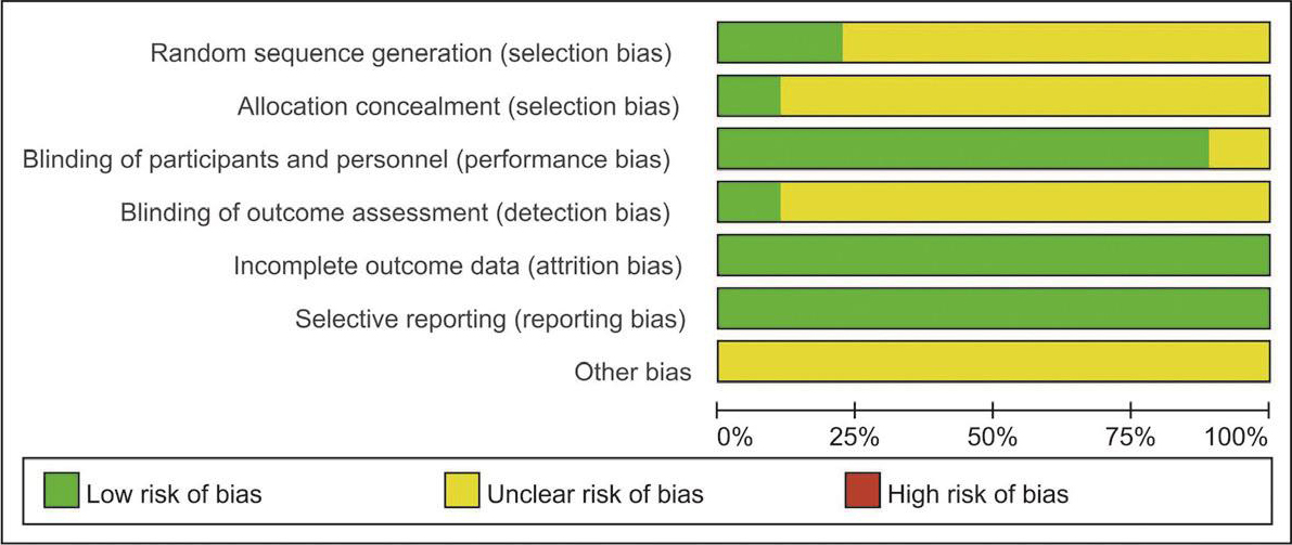 对原始研究的质量评价至关重要,纳入高质量的研究、合理地进行数据合并(非盲目、勉强的进行合并),方可得出较为稳定的结果。在质量评价方面,主要分为随机序列的产生、分配隐藏、盲法的实施(对研究者、受试对象、结局评价者)、不完整结局、发表性偏倚、其他6个方面的内容,最终形成“Risk of bias”的“红、黄、绿”点图。