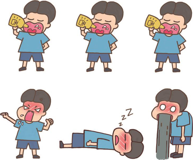 喝酒之后,老张站起来开始大骂,胡说八道,老李已经晕菜,而老王跑到厕所开始呕吐。老刘、老姜和老李一样,东倒西歪。