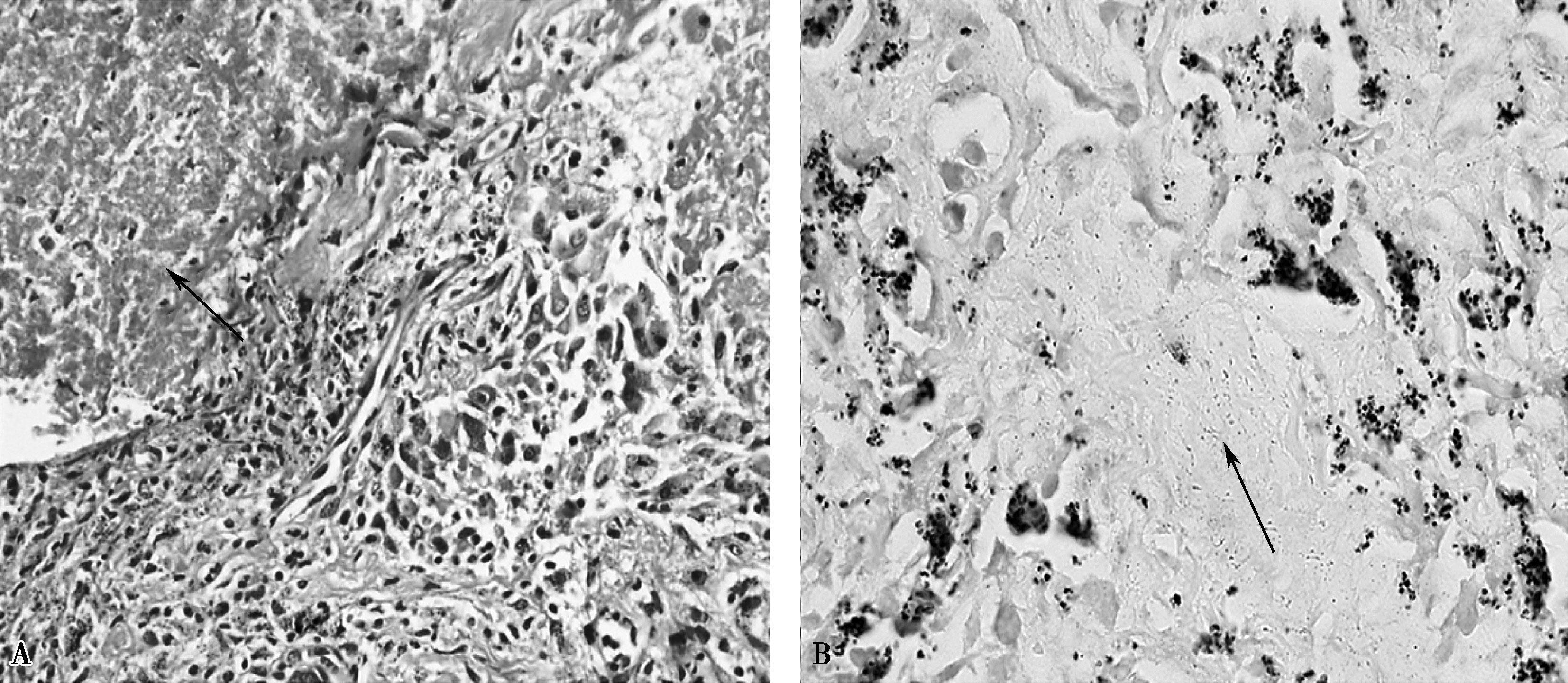 A.干酪样坏死(箭头所示);B.抗酸杆菌(箭头所示)