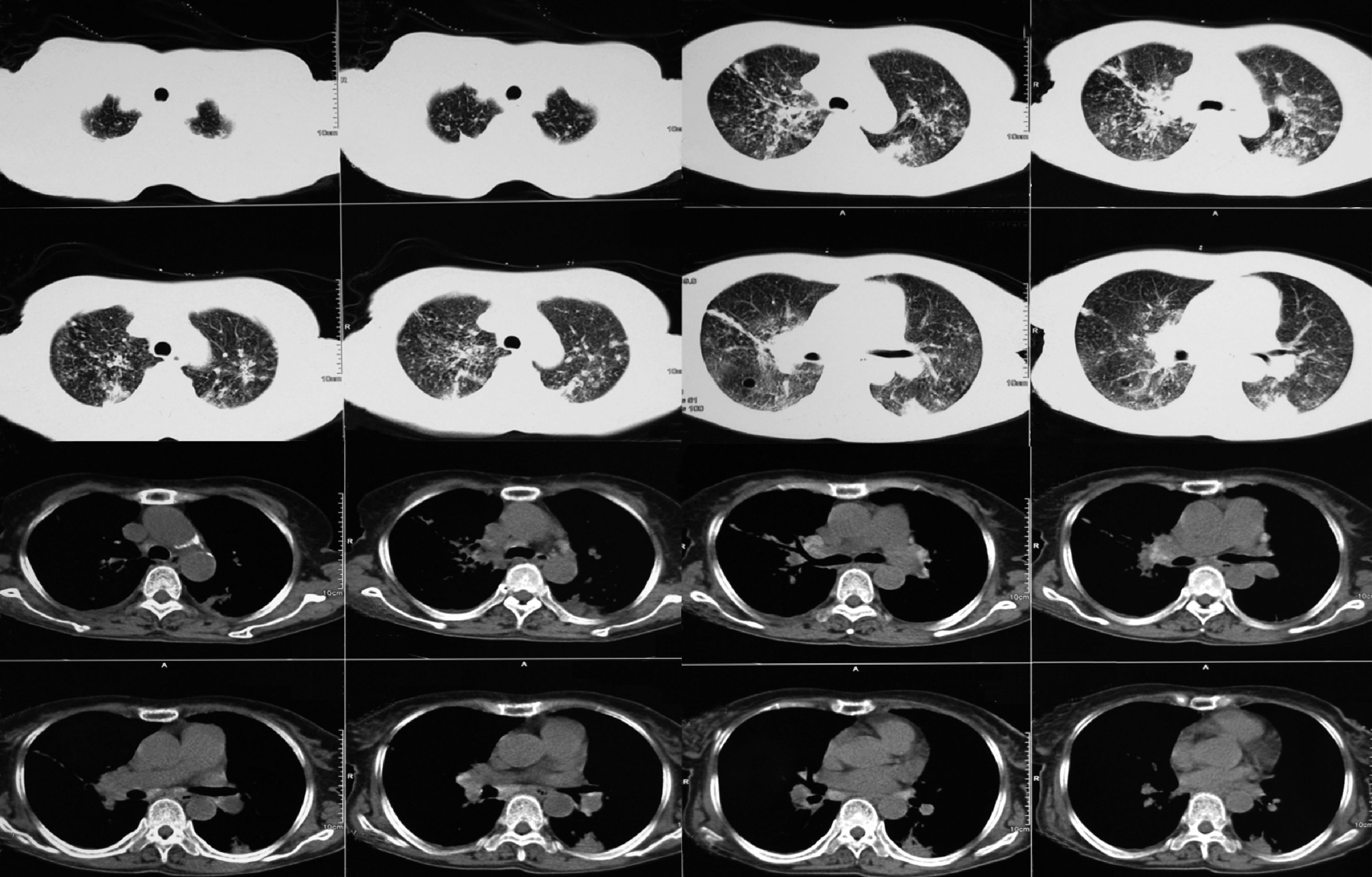 胸部CT:双肺多发斑片、结节影,以双肺上叶及下叶背段为主,多考虑肺结核;纵隔及肺门多发淋巴结肿大,部分钙化;左侧胸腔积液,双侧胸膜增厚(图10-1)。