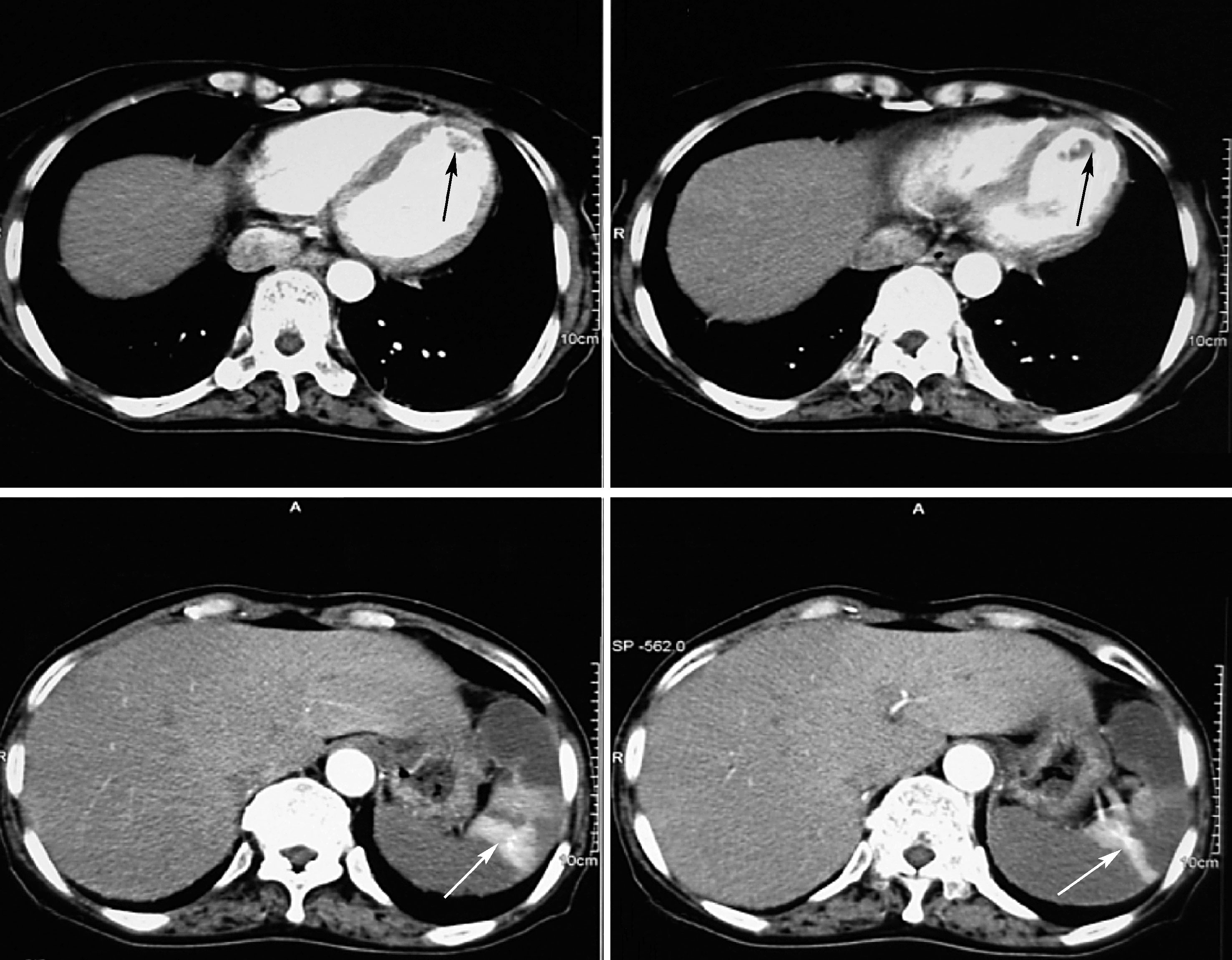 左心室血栓、脾梗死(箭头所示)