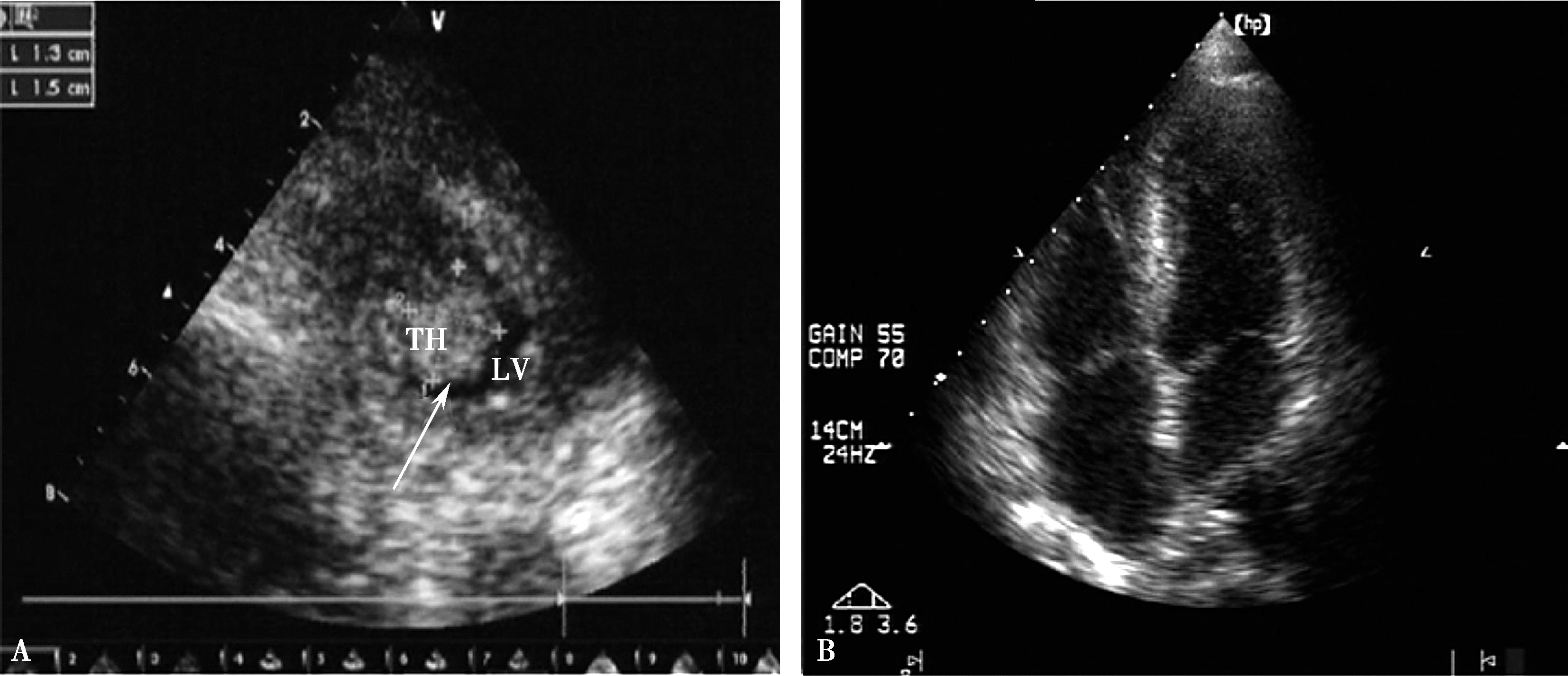 A.左心室血栓(箭头所示);B.左心室血栓消失