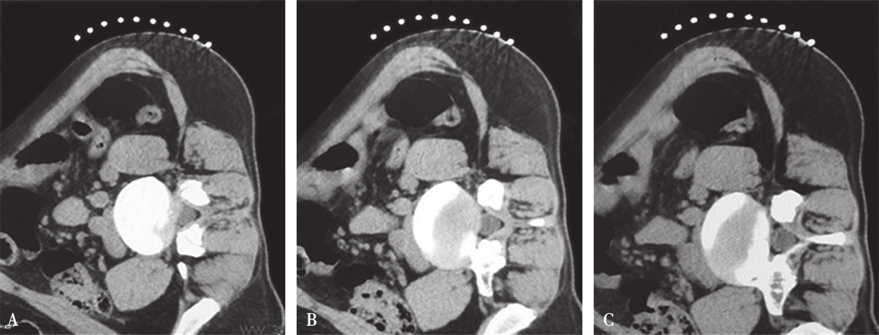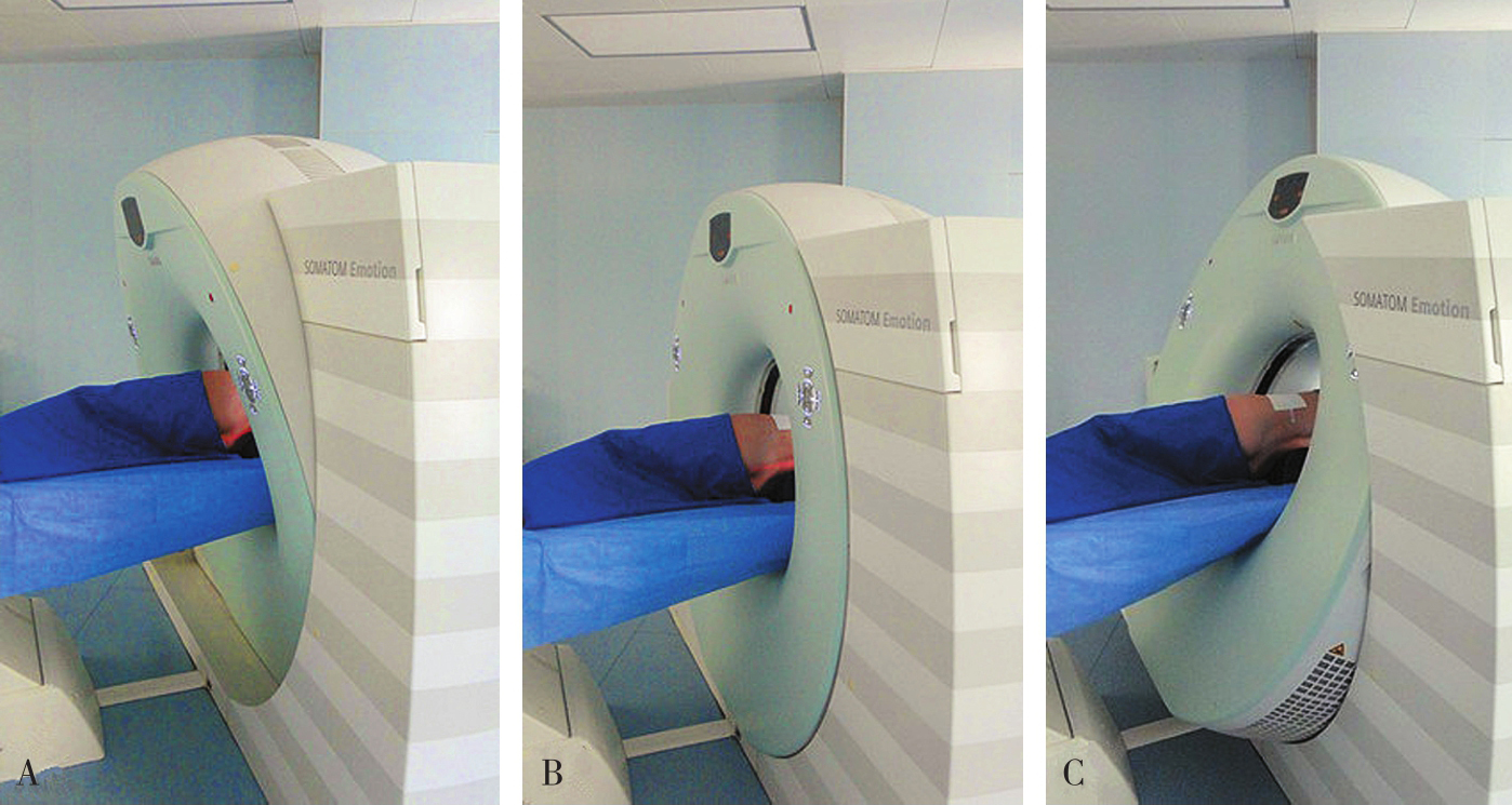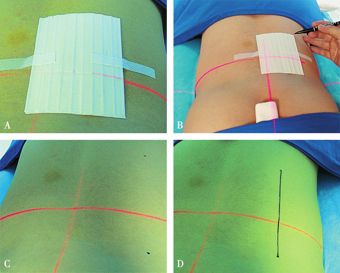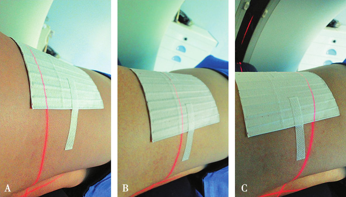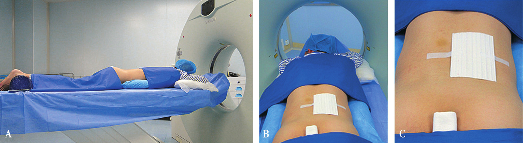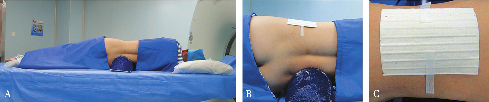A.体位摆放;B.粘放定位条贴;C.定位条贴局部图