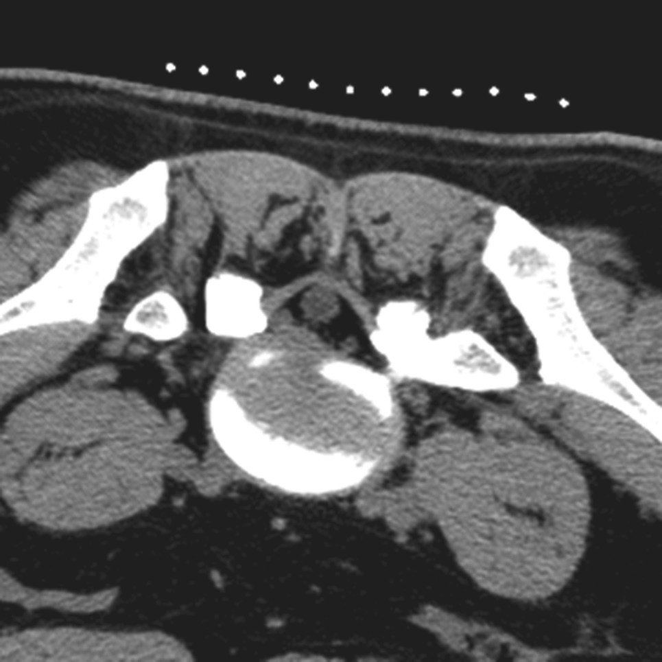 穿刺距离越短出现偏差的可能性越小。其中穿刺点的确定是关键,是“画龙点睛”之笔,其一旦确定,手术入路在靶点操作平面上的左右倾斜方向和深度也即确定,我们依靠CT激光投影线和定位条贴上的金属条进行确定,方法如下:在患者保持不动的情况下,随着CT机架扫描角度的变化,其在患者皮肤上的投影线位置也相应发生变化(图3-3-16A、B、C分别对应图3-3-8A、B、C);定位条贴的金属条在横断面上以点状显示(图3-3-17)。在靶点操作平面上设计出最佳手术入路,测量角度和深度(图3-3-18),其对应的金属条与CT投影线的交点即是穿刺点,用记号笔标记(图3-3-19)。