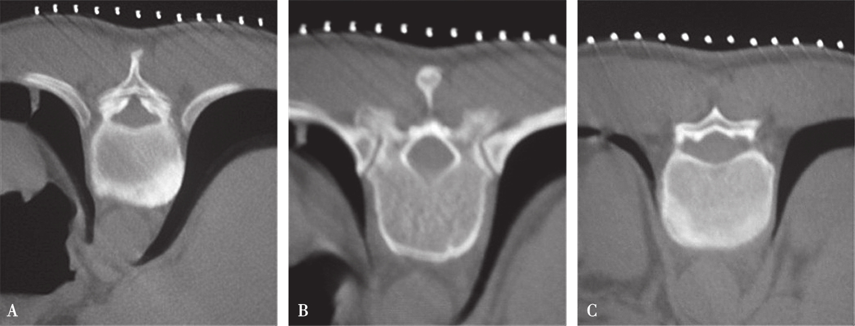 A.椎弓根偏头侧平面;B.椎弓根中间平面;C.椎弓根偏足侧平面