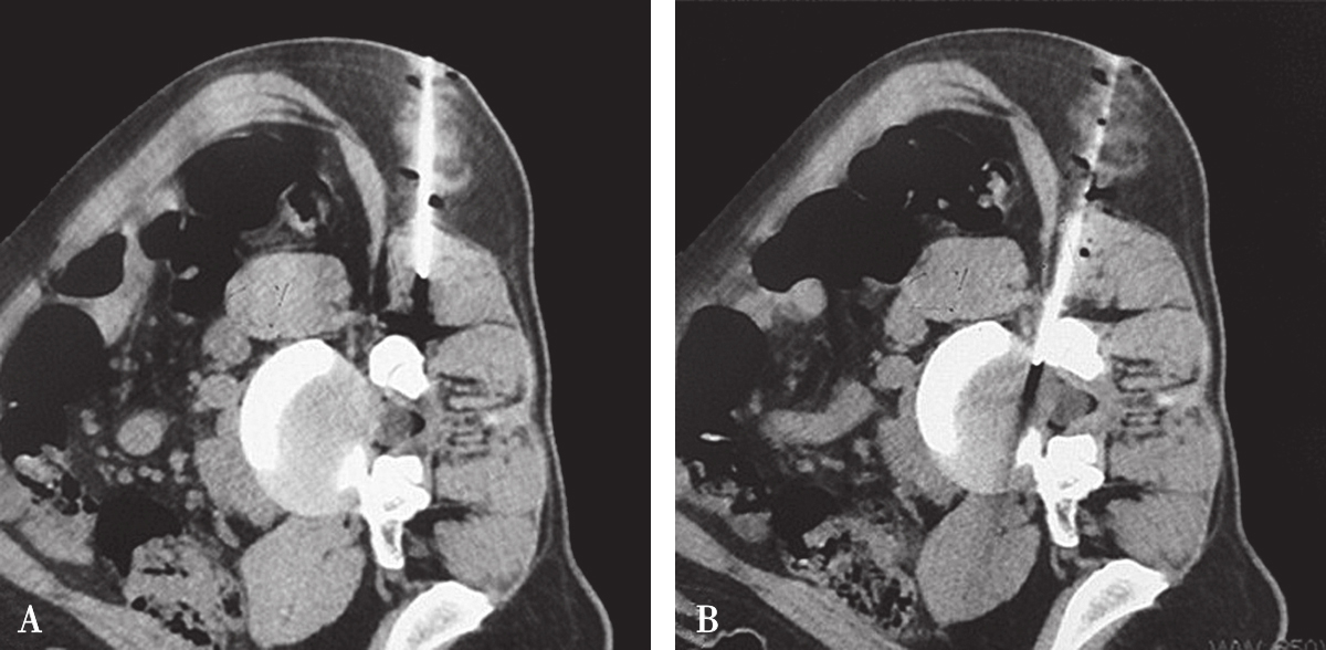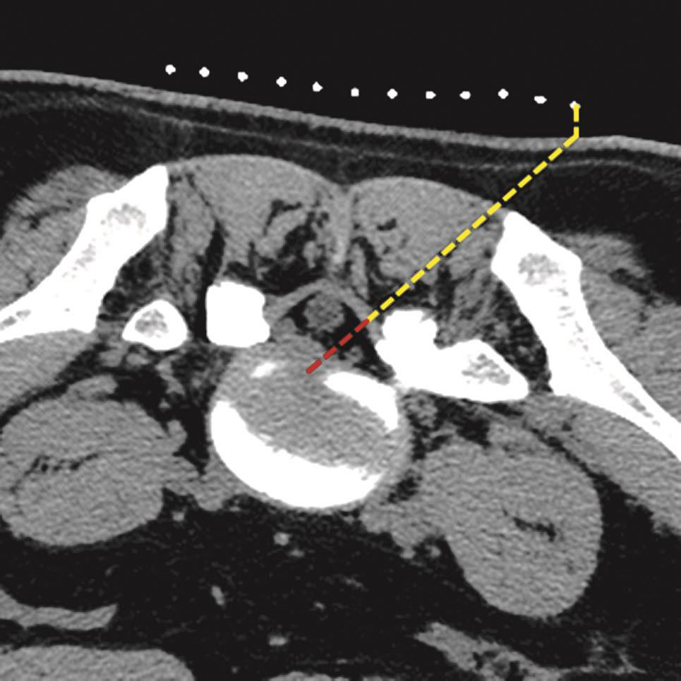 采取分段穿刺技术、借助CT适时扫描、监测矫正定位针位置才是保证安全无误的金标准。所谓分段穿刺技术是按照设计的手术入路,先在安全深度内目测下部分进针,根据CT扫描图像结果调整进针方向直至成功(图3-3-24、图3-3-25)。