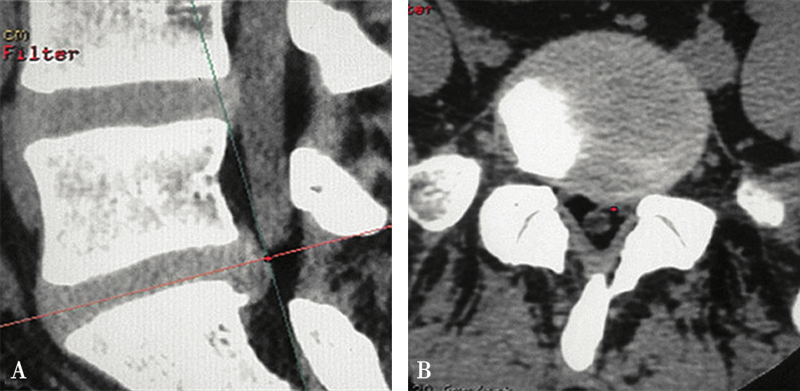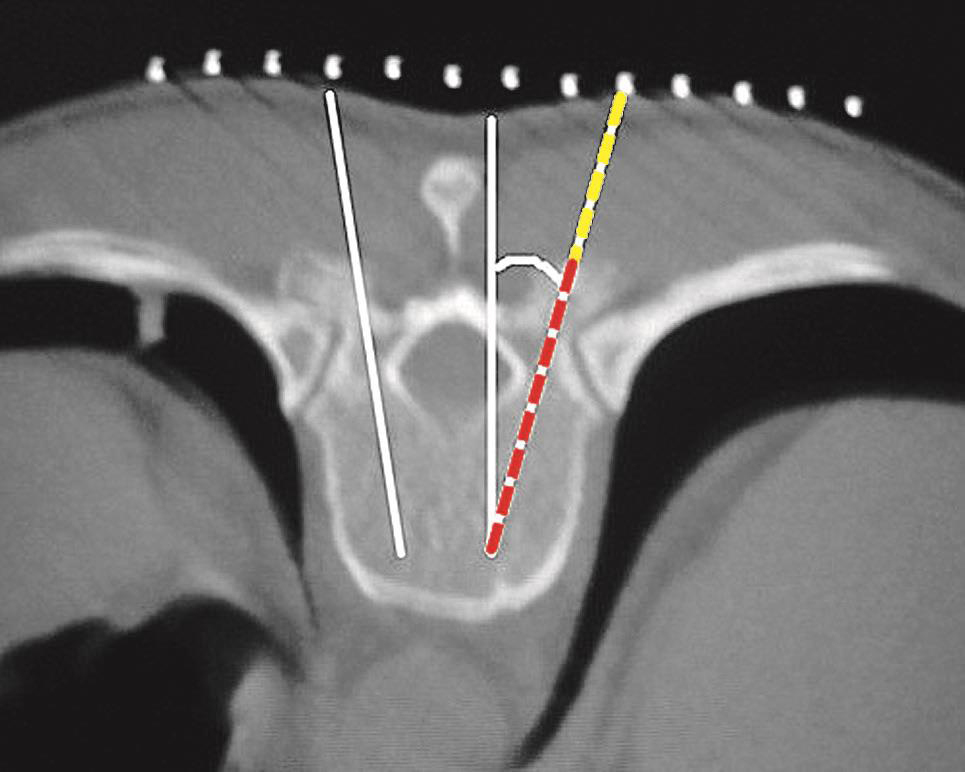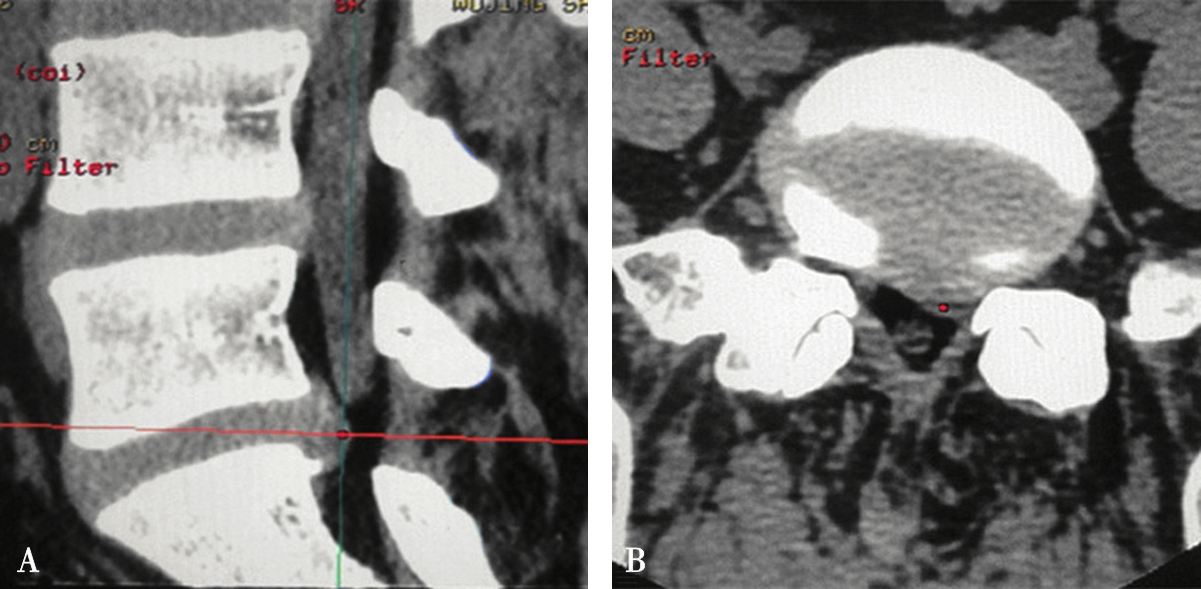 A.沿椎间隙轴线扫描(红坐标线);B.横断位层面多有椎板阻挡