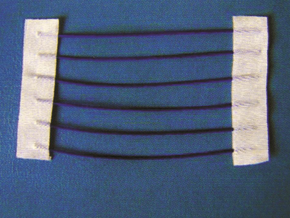 在拟行穿刺点附近粘放定位条贴是确定穿刺点的有效举措,我们曾应用金属丝编制的定位网(图3-3-3),也有报道应用造影导管制成栅格样式的(图3-3-4),我们现在常用的是制作简单、与皮肤易贴近的双层胶布含夹等距离金属条做成的定位条贴(图3-3-5)。