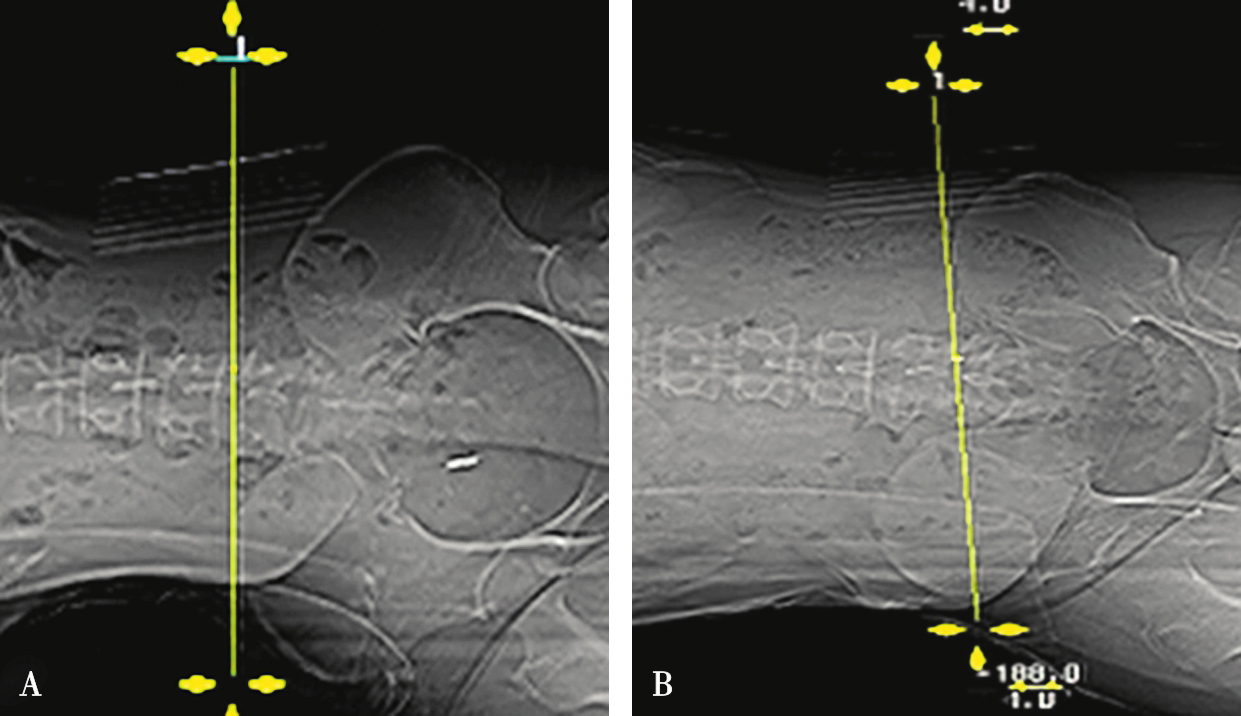 无论什么手术都必须做TOP像扫描,在其上确定手术部位和断层扫描范围。如侧卧位时的椎间隙侧方穿刺入路做脊柱的正位TOP像(图3-3-6),俯卧位时的椎板间入路做脊柱的侧位TOP像(图3-3-7)。