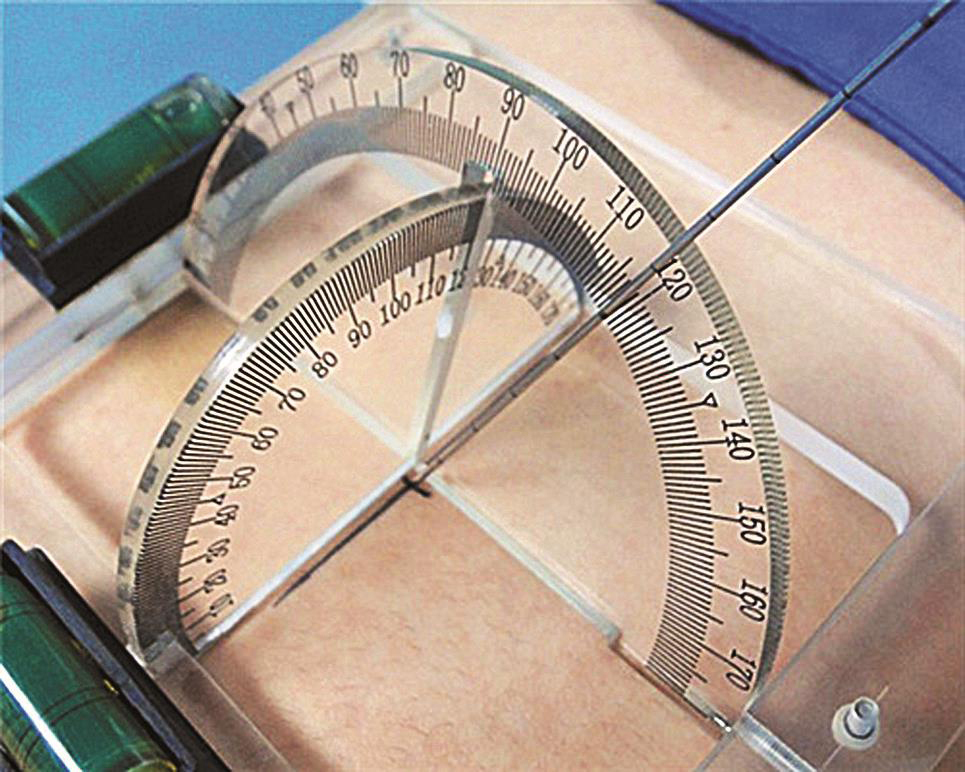 怎样将定位针按照设计的入路准确地完成穿刺呢?穿刺三要素中的穿刺点和深度较容易掌握,关键难点是穿刺角度的掌握,“差之毫厘、谬之千里”,虽然有各种减少误差的方法,我们也曾研究过定向仪[有机玻璃制作的两同心半圆仪组成,大半圆仪骑跨于小半圆仪上,既能转动又保持同心(图3-3-20)。通过小半圆仪显示大半圆仪的倾斜度,使其与靶点操作平面的头足倾斜角度一致(图3-3-21),将穿刺针贴放于大半圆仪上,针尖对准穿刺点,针体调整到断面手术入路的倾斜角度(图3-3-22),如此(图3-3-23)穿刺针的方向即与设计的一致]用于确定穿刺针的两个角度,但在实践中均难以达到准确无误、一次穿刺成功。