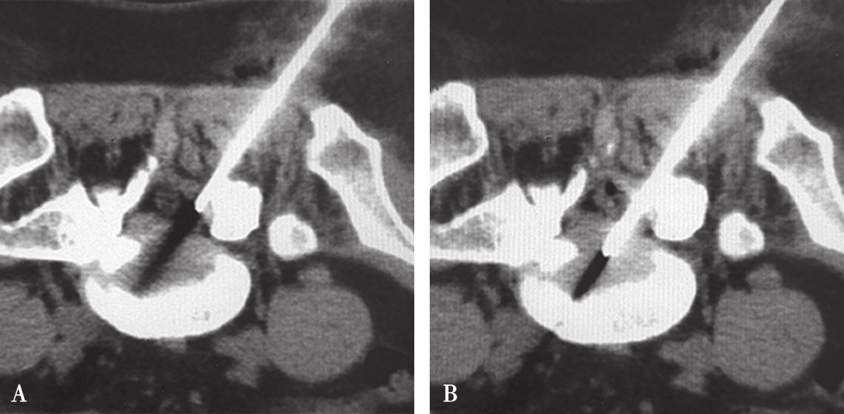 图3-3-24 经椎间孔侧方入路分段穿刺图像