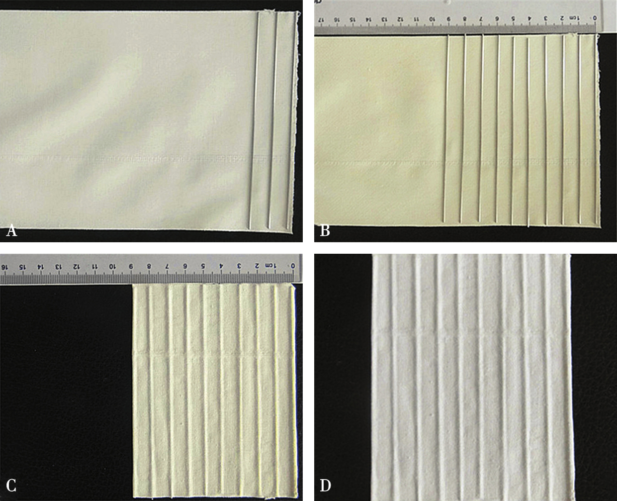 A.在长方形胶布上粘放金属条;B.等距离放置完毕;C.将胶布折叠加压;D.制作完成