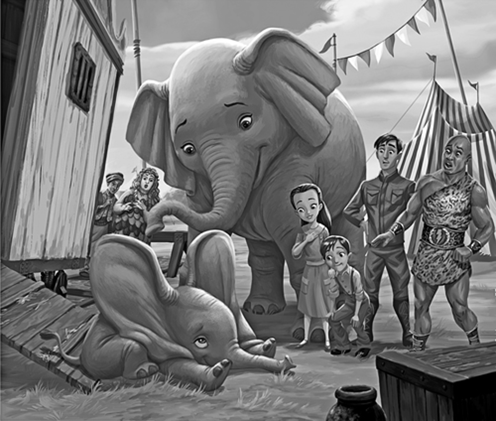 Rufus beckoned his men into the car and they advanced on Mrs. Jumbo, who backed away nervously, trumpeting and swinging her head side to side.