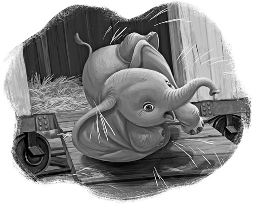 Reaching up, Rufus unhinged part of the wall and slammed it down, scaring Mrs. Jumbo. As she scrambled away, she wound up on the ramp, slipping and sliding toward the ground. The men hurried after her, herding her with their arms and poles. Rufus pushed on her head, shoving her backward down the ramp.