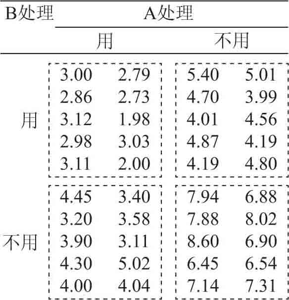 析因设计是多因素多水平全面组合,每一种组合就是一个研究分组的试验设计方法。试验设计模式图见图2-5。图中可见研究2个因素,因素 A 有用和不用2个水平,因素 B 有用和不用2个水平,2×2全面组合,将有4组,如图中4个框。