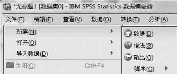 “新建”选项为创建新的SPSS相关文件,如图5-2所示。可以新建4种窗口文件(数据窗口、语法窗口、结果输出窗口和脚本),其中最常用的是“数据窗口”。语法对于相对高级用户才用到;“结果输出窗口”是自动弹出的,可以不管;“脚本”更是高级用户才用,平时基本不用。而“打开”菜单与“新建”相对应,新建的文件存储后,下次都可以直接打开。