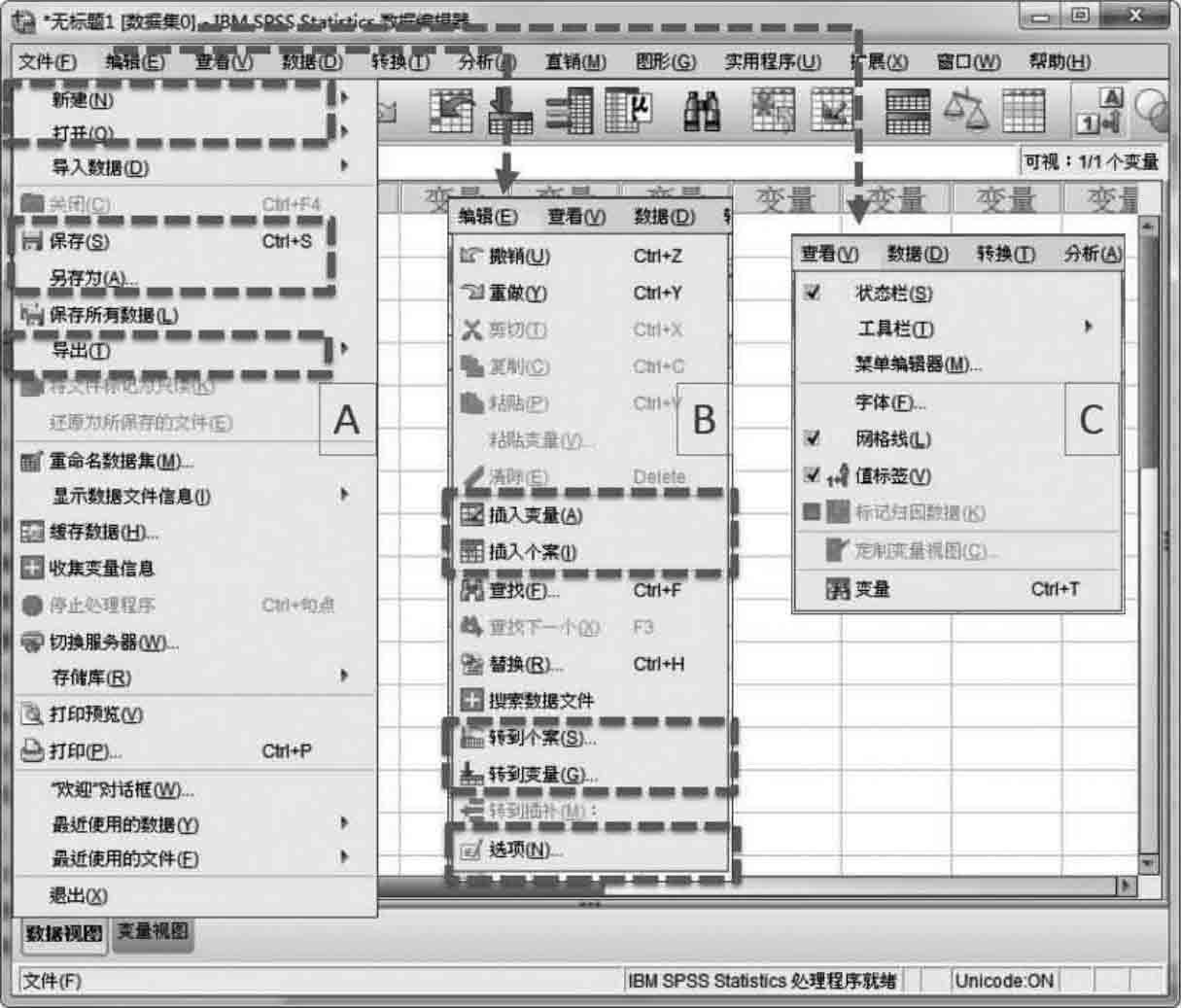 “查看”菜单平时很少用到,即使不会使用也不会影响到数据分析的结果。其中的“字体”可以帮助我们更改字体设置;状态栏用于显示是否显示系统状态,取消后,SPSS数据视图将变得更加简洁,但建议初学者保留。因为有时对SPSS进行了相关操作,初学者容易忘记,状态栏会给予提示。具体见图5-1(C)部分。另外软件不用担心被用坏,感兴趣的读者可以每个功能都试试!
