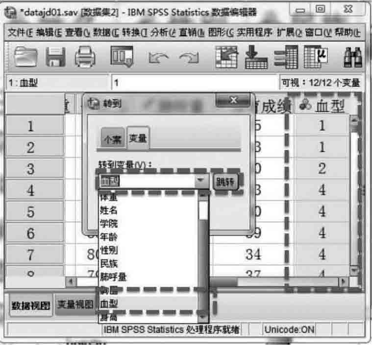 转至变量菜单操作:编辑—转到变量,弹出图5-5。下拉框找到“血型”,点击“跳转”,可以直接定位到“血型”变量。