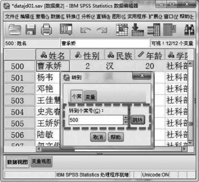 转至个案菜单操作:编辑—转到个案,弹出图5-4。框中输入“500”数据,然后点击“跳转”即可。